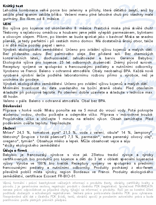 Lahodná kombinace velké porce bio zeleniny a přílohy, která děťátko zasytí, aniž by zatížila před spaním zatížila bříško. Večerní menu plné lahodné chuti pro všechny malé gurmány. Bio říkrm od 8. měsíce.