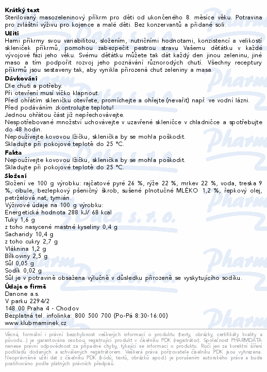 Sterilovaný masozeleninový příkrm pro děti od ukončeného 8. měsíce věku. Potravina pro zvláštní výživu pro kojence a malé děti. Bez konzervantů a přidané soli.