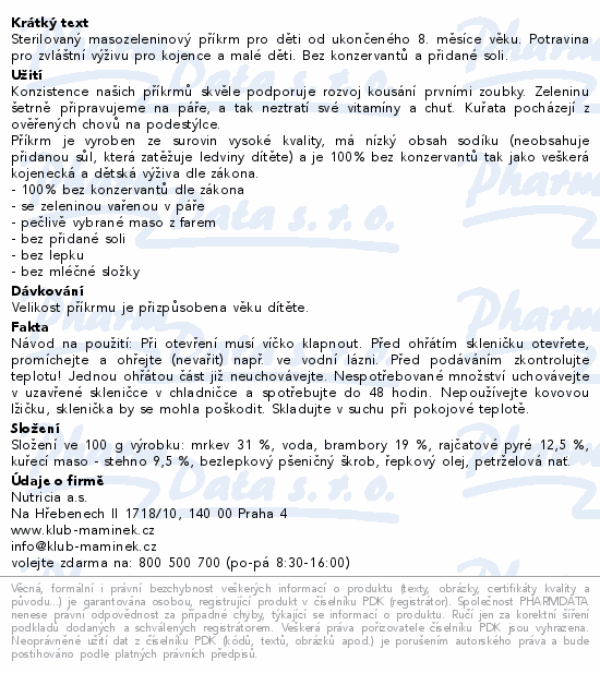 Sterilovaný masozeleninový příkrm pro děti od ukončeného 8. měsíce věku. Potravina pro zvláštní výživu pro kojence a malé děti. Bez konzervantů a přidané soli.