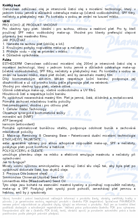 Osmoclean odličovací olej je intenzivně čisticí olej s micelární technologií, který v jednom kroku jemně a důkladně odstraňuje make-up (včetně voděodolného), SPF filtry, nečistoty a přebytečný maz. Po kontaktu s vodou se změní na luxusní mléko.