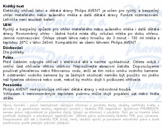 Elektrický ohřívač lahví a dětské stravy Philips AVENT je určen pro rychlý a bezpečný ohřev mateřského nebo sušeného mléka a další dětské stravy. Funkce rozmrazování. Lahvička není součástí balení.