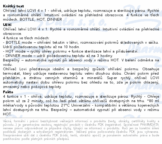 Ohřívač lahví LOVI 4 v 1 - ohřívá, udržuje teplotu, rozmrazuje a sterilizuje párou. Rychlé a rovnoměrné ohřátí. Intuitivní ovládání na přehledné obrazovce. 4 funkce ve třech módech. BOTTLE, HOT, DINNER .