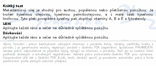 Makadamiový olej je vhodný pro suchou, popálenou nebo přetíženou pokožkou. Je tvořen kyselinou olejovou, kyselinou palmitoolejovou, a z malé části kyselinou linolovou. Tyto pleti prospěšné kyseliny pak doplňují vitamíny A, B a E a fytosteroly.