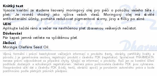 Vysoce kvalitní za studena lisovaný moringový olej pro péči o pokožku vašeho těla i pleti. Je rovněž vhodný jako výživa vašich vlasů. Moringový olej má skvělé antibakteriální účinky, pomáhá redukovat pigmentové skvrny, jizvy a flíčky po akné.