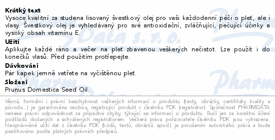 Vysoce kvalitní za studena lisovaný švestkový olej pro vaši každodenní péči o pleť, ale i vlasy. Švestkový olej je vyhledávaný pro své antioxidační, zvláčňující, pečující účinky a vysoký obsah vitamínu E.