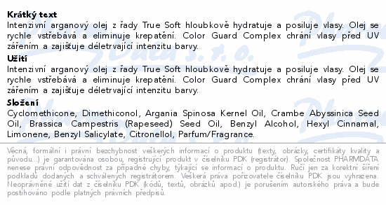 Intenzivní arganový olej z řady True Soft hloubkově hydratuje a posiluje vlasy. Olej se rychle vstřebává a eliminuje krepatění. Color Guard Complex chrání vlasy před UV zářením a zajišťuje déletrvající intenzitu barvy.