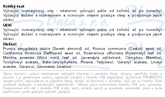 Vyživující rozmarýnový olej - intenzivní vyživující péče od kořínků až po konečky! Vyživující složení s rozmarýnem a ricinovým olejem posiluje vlasy a podporuje jejich zdraví.
