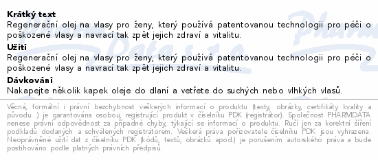 Regenerační olej na vlasy pro ženy, který používá patentovanou technologii pro péči o poškozené vlasy a navrací tak zpět jejich zdraví a vitalitu.
