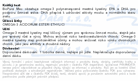 BioPure Max obsahuje omega-3 polynenasycené mastné kyseliny EPA a DHA pro podporu činnosti srdce. DHA přispívá k udržování aktivity mozku a normálního stavu zraku.