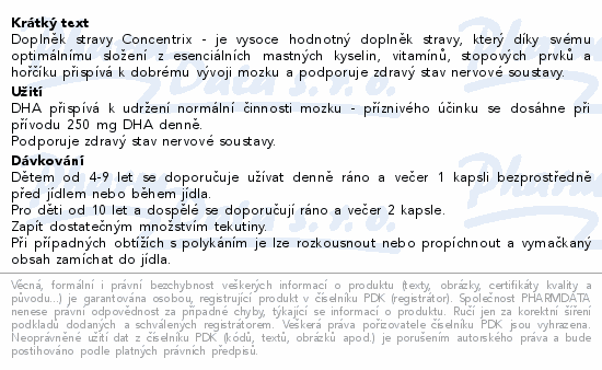 Doplněk stravy Concentrix - je vysoce hodnotný doplněk stravy, který díky svému optimálnímu složení z esenciálních mastných kyselin, vitamínů, stopových prvků a hořčíku přispívá k dobrému vývoji mozku a podporuje zdravý stav nervové soustavy.