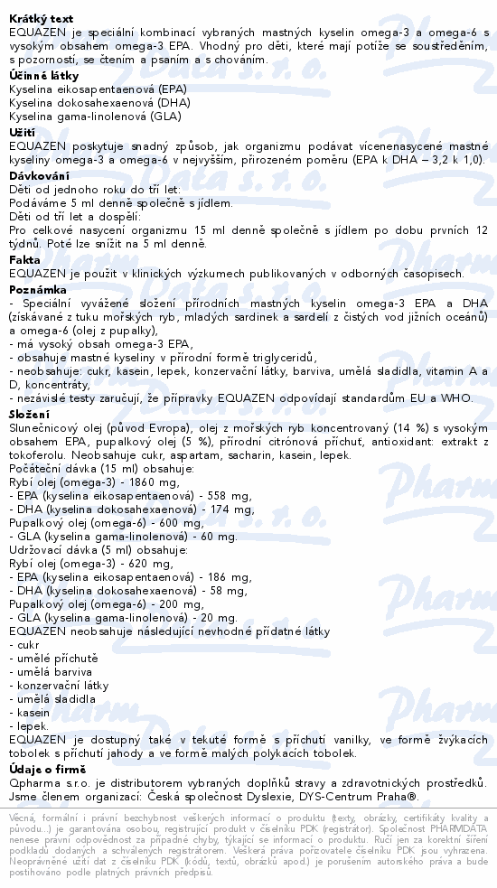 EQUAZEN je speciální kombinací vybraných mastných kyselin omega-3 a omega-6 s vysokým obsahem omega-3 EPA. Vhodný pro děti, které mají potíže se soustředěním, s pozorností, se čtením a psaním a s chováním.