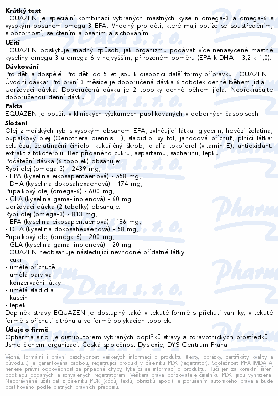 EQUAZEN je speciální kombinací vybraných mastných kyselin omega-3 a omega-6 s vysokým obsahem omega-3 EPA. Vhodný pro děti, které mají potíže se soustředěním, s pozorností, se čtením a psaním a s chováním.