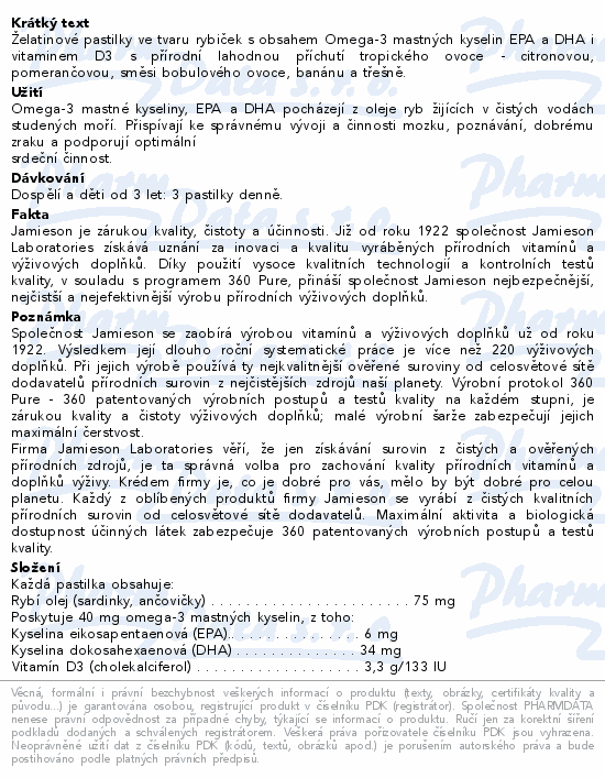 Želatinové pastilky ve tvaru rybiček s obsahem Omega-3 mastných kyselin EPA a DHA i vitaminem D3 s přírodní lahodnou příchutí tropického ovoce - citronovou, pomerančovou, směsi bobulového ovoce, banánu a třešně.