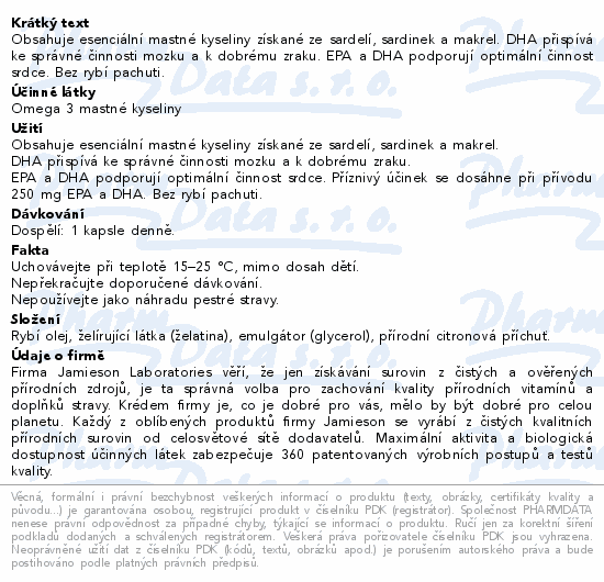 Obsahuje esenciální mastné kyseliny získané ze sardelí, sardinek a makrel. DHA přispívá ke správné činnosti mozku a k dobrému zraku. EPA a DHA podporují optimální činnost srdce. Bez rybí pachuti.