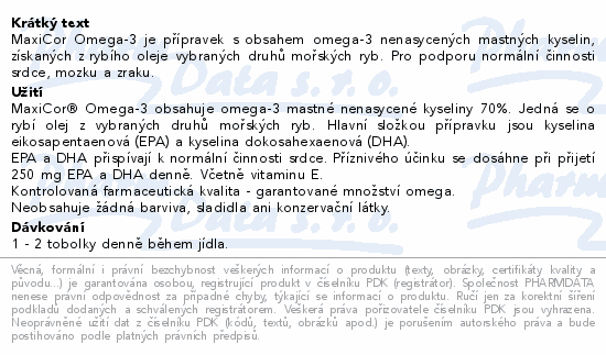MaxiCor Omega-3 je přípravek s obsahem omega-3 nenasycených mastných kyselin, získaných z rybího oleje vybraných druhů mořských ryb. Pro podporu normální činnosti srdce, mozku a zraku.