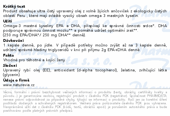 Produkt obsahuje ultra čistý upravený olej z volně žijících ančoviček z ekologicky čistých oblastí Peru , které mají zvláště vysoký obsah omega 3 mastných kyselin.