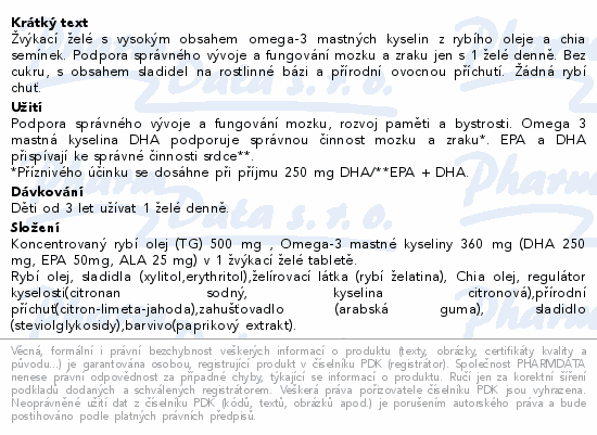 Žvýkací želé s vysokým obsahem omega-3 mastných kyselin z rybího oleje a chia semínek. Podpora správného vývoje a fungování mozku a zraku jen s 1 želé denně. Bez cukru, s obsahem sladidel na rostlinné bázi a přírodní ovocnou příchutí. Žádná rybí chuť.