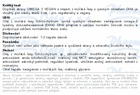 Doplněk stravy OMEGA 3 VEGAN s olejem z mořské řasy s vysokým obsahem DHA je vhodný pro osoby starší 3 let, i pro vegetariány a vegany.