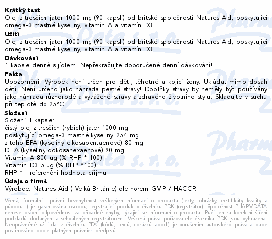 Olej z tresčích jater 1000 mg (90 kapslí) od britské společnosti Natures Aid, poskytující omega-3 mastné kyseliny, vitamín A a vitamín D3.