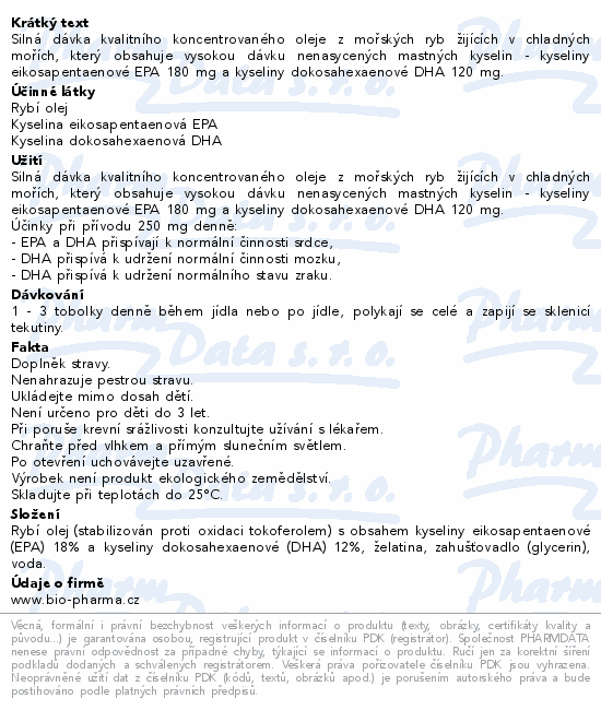 Silná dávka kvalitního koncentrovaného oleje z mořských ryb žijících v chladných mořích, který obsahuje vysokou dávku nenasycených mastných kyselin - kyseliny eikosapentaenové EPA 180 mg a kyseliny dokosahexaenové DHA 120 mg.