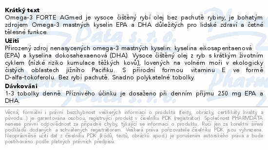 Omega-3 FORTE AGmed je vysoce čištěný rybí olej bez pachutě rybiny, je bohatým zdrojem Omega-3 mastných kyselin EPA a DHA důležitých pro lidské zdraví a četné tělesné funkce.
