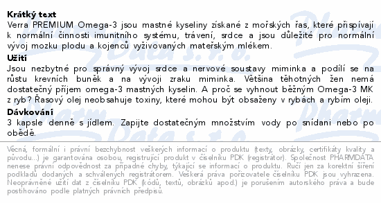Verra PREMIUM Omega-3 jsou mastné kyseliny získané z mořských řas, které přispívají k normální činnosti imunitního systému, trávení, srdce a jsou důležité pro normální vývoj mozku plodu a kojenců vyživovaných mateřským mlékem.