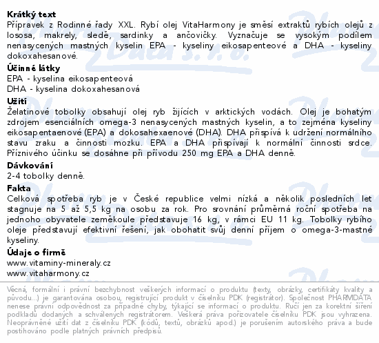 Přípravek z Rodinné řady XXL. Rybí olej VitaHarmony je směsí extraktů rybích olejů z lososa, makrely, sledě, sardinky a ančovičky. Vyznačuje se vysokým podílem nenasycených mastných kyselin EPA - kyseliny eikosapenteové a DHA - kyseliny dokoxahesanové.