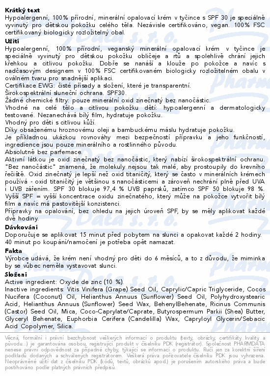 Hypoalergenní, 100% přírodní, minerální opalovací krém v tyčince s SPF 30 je speciálně vyvinutý pro dětskou pokožku celého těla. Nezávisle certifikováno, vegan. 100% FSC certifikovaný biologicky rozložitelný obal.