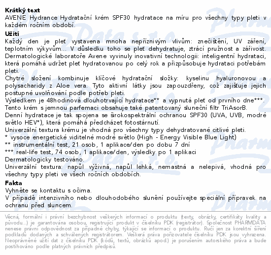 AVENE Hydrance Hydratační krém SPF30 hydratace na míru pro všechny typy pleti v každém ročním období.