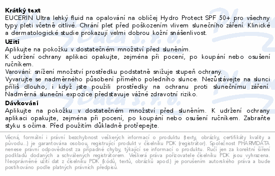 EUCERIN Ultra lehký fluid na opalování na obličej Hydro Protect SPF 50+ pro všechny typy pleti včetně citlivé. Chrání pleť před poškozením vlivem slunečního záření. Klinické a dermatologické studie prokazují velmi dobrou kožní snášenlivost.