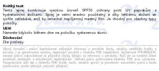 Tento sprej kombinuje vysokou úroveň SPF50 ochrany proti UV paprskům s hydratačními složkami. Sprej je velmi snadno použitelný a díky lehkému složení se rychle vstřebává, aniž by zanechal nepříjemný mastný film. Je vhodný pro všechny typy pokožky.