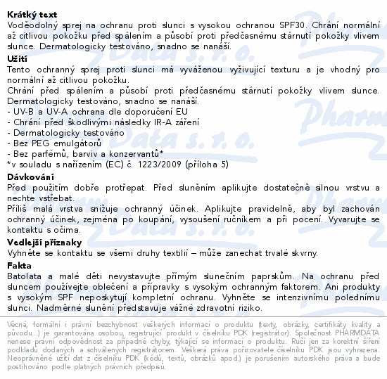 Voděodolný sprej na ochranu proti slunci s vysokou ochranou SPF30. Chrání normální až citlivou pokožku před spálením a působí proti předčasnému stárnutí pokožky vlivem slunce. Dermatologicky testováno, snadno se nanáší.
