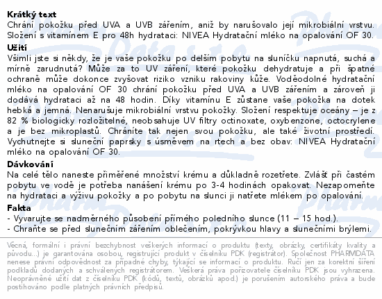 Chrání pokožku před UVA a UVB zářením, aniž by narušovalo její mikrobiální vrstvu. Složení s vitamínem E pro 48h hydrataci: NIVEA Hydratační mléko na opalování OF 30.