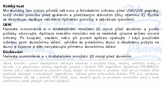 Moisturising Sun Lotion přináší celkovou a fotostabilní ochranu před UVA/UVB paprsky, tudíž chrání pokožku před spálením a předčasným stárnutím (díky vitamínu E). Rychle se absorbuje, zajišťuje celodenní hydrataci pokožky a zabraňuje vysoušení.