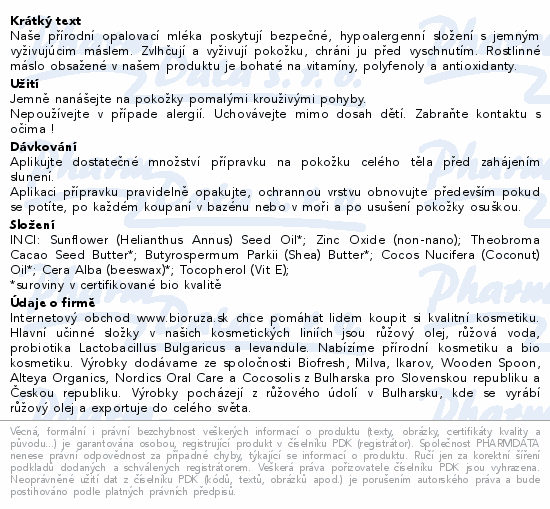 Naše přírodní opalovací mléka poskytují bezpečné, hypoalergenní složení s jemným vyživujúcim máslem. Zvlhčují a vyživují pokožku, chráni ju před vyschnutím. Rostlinné máslo obsažené v našem produktu je bohaté na vitamíny, polyfenoly a antioxidanty.