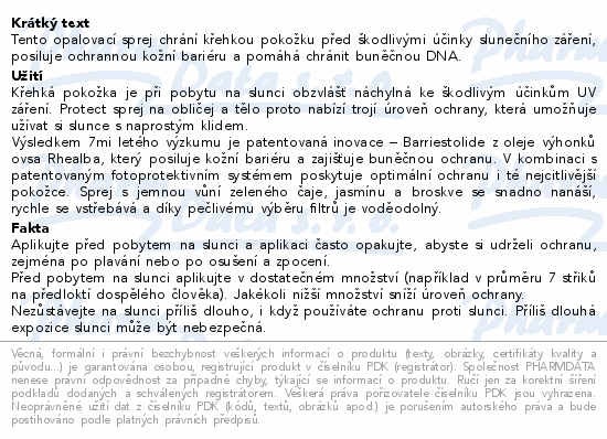 Tento opalovací sprej chrání křehkou pokožku před škodlivými účinky slunečního záření, posiluje ochrannou kožní bariéru a pomáhá chránit buněčnou DNA.