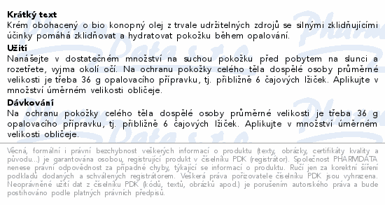 Krém obohacený o bio konopný olej z trvale udržitelných zdrojů se silnými zklidňujícími účinky pomáhá zklidňovat a hydratovat pokožku během opalování.