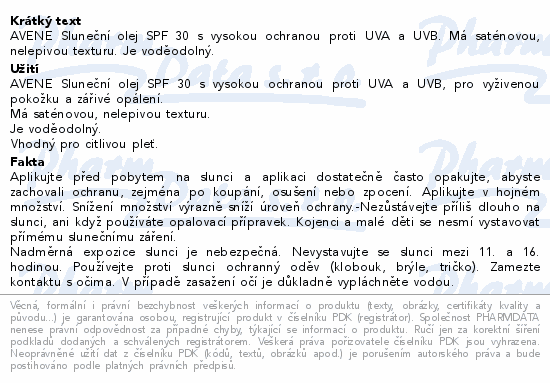 AVENE Sluneční olej SPF 30 s vysokou ochranou proti UVA a UVB. Má saténovou, nelepivou texturu. Je voděodolný.