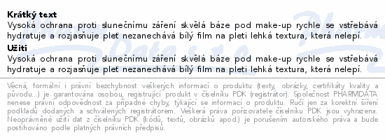 Vysoká ochrana proti slunečnímu záření skvělá báze pod make-up rychle se vstřebává hydratuje a rozjasňuje pleť nezanechává bílý film na pleti lehká textura, která nelepí.
