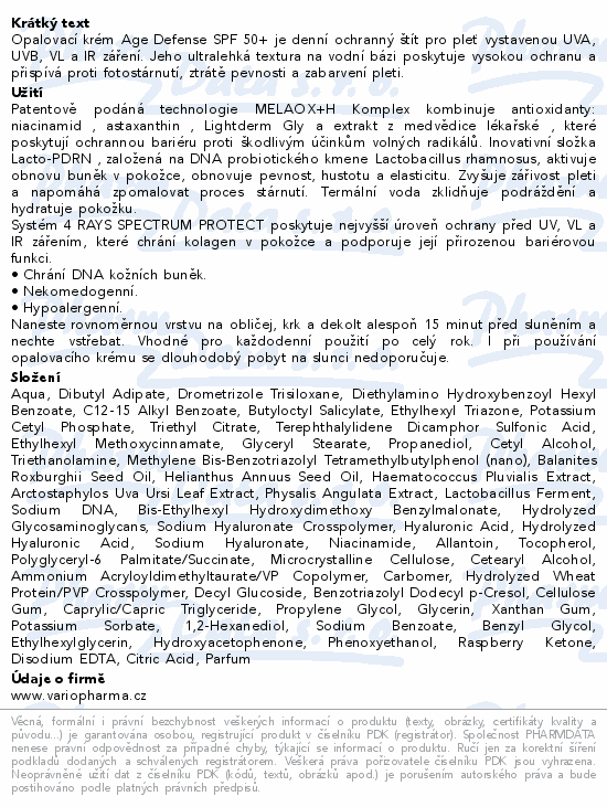 Opalovací krém Age Defense SPF 50+ je denní ochranný štít pro pleť vystavenou UVA, UVB, VL a IR záření. Jeho ultralehká textura na vodní bázi poskytuje vysokou ochranu a přispívá proti fotostárnutí, ztrátě pevnosti a zabarvení pleti.