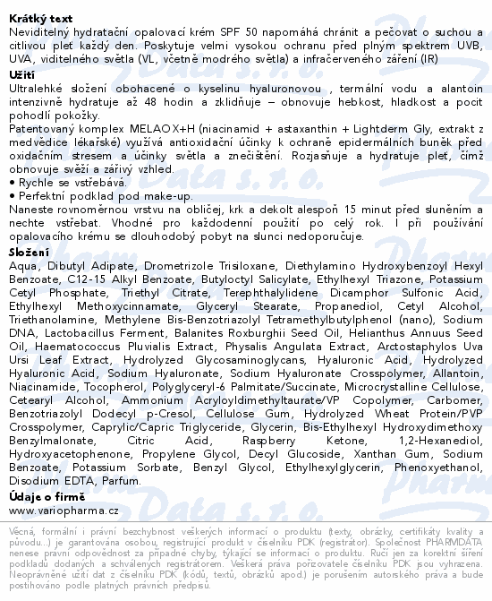 Neviditelný hydratační opalovací krém SPF 50 napomáhá chránit a pečovat o suchou a citlivou pleť každý den. Poskytuje velmi vysokou ochranu před plným spektrem UVB, UVA, viditelného světla (VL, včetně modrého světla) a infračerveného záření (IR)