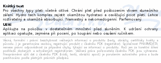Pro všechny typy pleti včetně citlivé. Chrání pleť před poškozením vlivem slunečního záření. Hydro tech komplex zajistit okamžitou hydrataci a osvěžující pocit pleti. Lehce roztíratelný a okamžitě absorbující. Nemastný a nekomedogenní. Parfemovaný.