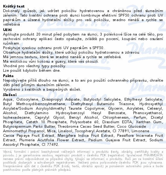 Dokonalý způsob, jak udržet pokožku hydratovanou a chráněnou před slunečním zářením. Tato kvalitní ochrana proti slunci kombinuje efektivní SPF50 ochranu proti UV paprskům a úžasné hydratační složky pro vaši pokožku, snadno nanáší a rychle se vstřebává