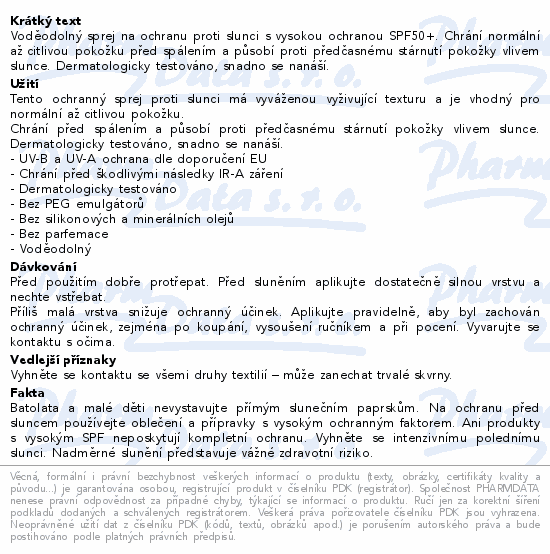 Voděodolný sprej na ochranu proti slunci s vysokou ochranou SPF50+. Chrání normální až citlivou pokožku před spálením a působí proti předčasnému stárnutí pokožky vlivem slunce. Dermatologicky testováno, snadno se nanáší.