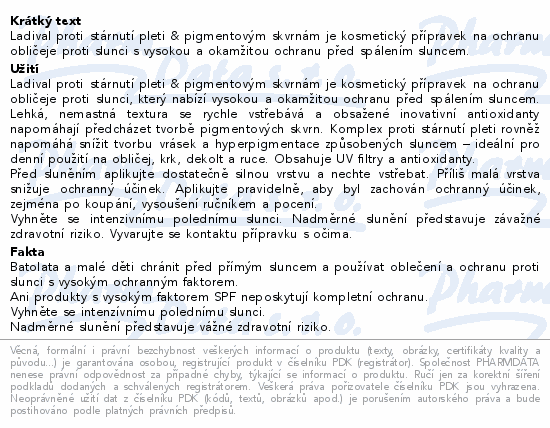 Ladival proti stárnutí pleti & pigmentovým skvrnám je kosmetický přípravek na ochranu obličeje proti slunci s vysokou a okamžitou ochranu před spálením sluncem.