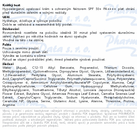 Hypoalergenní opalovací krém s ochranným faktorem SPF 50+ PA++++ pleť chrání před slunečním zářením a volnými radikály.
