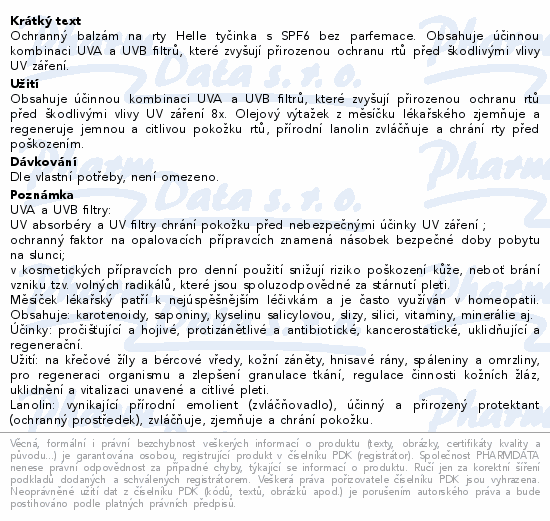 Ochranný balzám na rty Helle tyčinka s SPF6 bez parfemace. Obsahuje účinnou kombinaci UVA a UVB filtrů, které zvyšují přirozenou ochranu rtů před škodlivými vlivy UV záření.