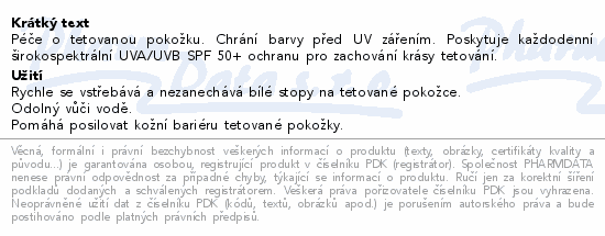 Péče o tetovanou pokožku. Chrání barvy před UV zářením. Poskytuje každodenní širokospektrální UVA/UVB SPF 50+ ochranu pro zachování krásy tetování.