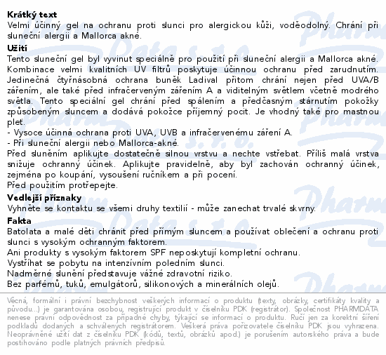 Velmi účinný gel na ochranu proti slunci pro alergickou kůži, voděodolný. Chrání při sluneční alergii a Mallorca akné.
