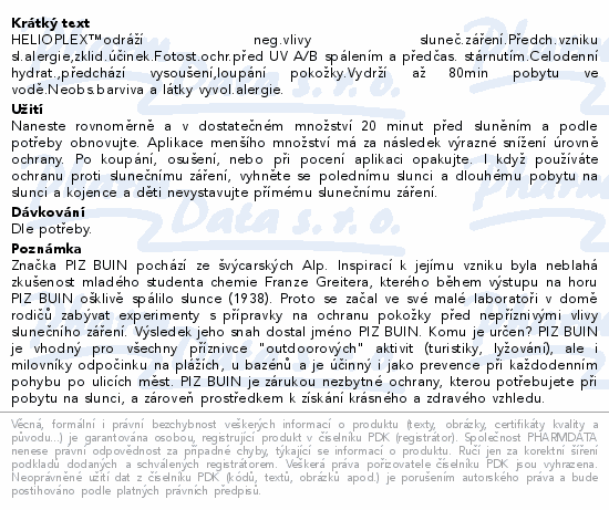 HELIOPLEX™odráží neg.vlivy sluneč.záření.Předch.vzniku sl.alergie,zklid.účinek.Fotost.ochr.před UV A/B spálením a předčas. stárnutím.Celodenní hydrat.,předchází vysoušení,loupání pokožky.Vydrží až 80min pobytu ve vodě.Neobs.barviva a látky vyvol.alergie.